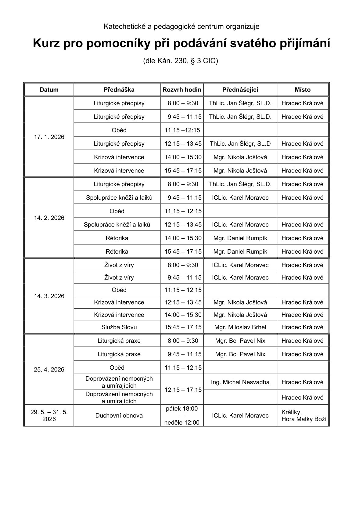 "Kurz pro pomocníky při podávání sv. přijímání Biskupství královéhradecké opět pořádá v Hradci Králové, v budově Nového Adalbertina, kurz pro pomocníky při podávání svatého přijímání (dle kán. 230, § 3 CIC). Kurz se bude konat v termínu leden–květen 2026, pokud se přihlásí minimálně 15 zájemců. Maximální počet je stanoven na 30 zájemců.