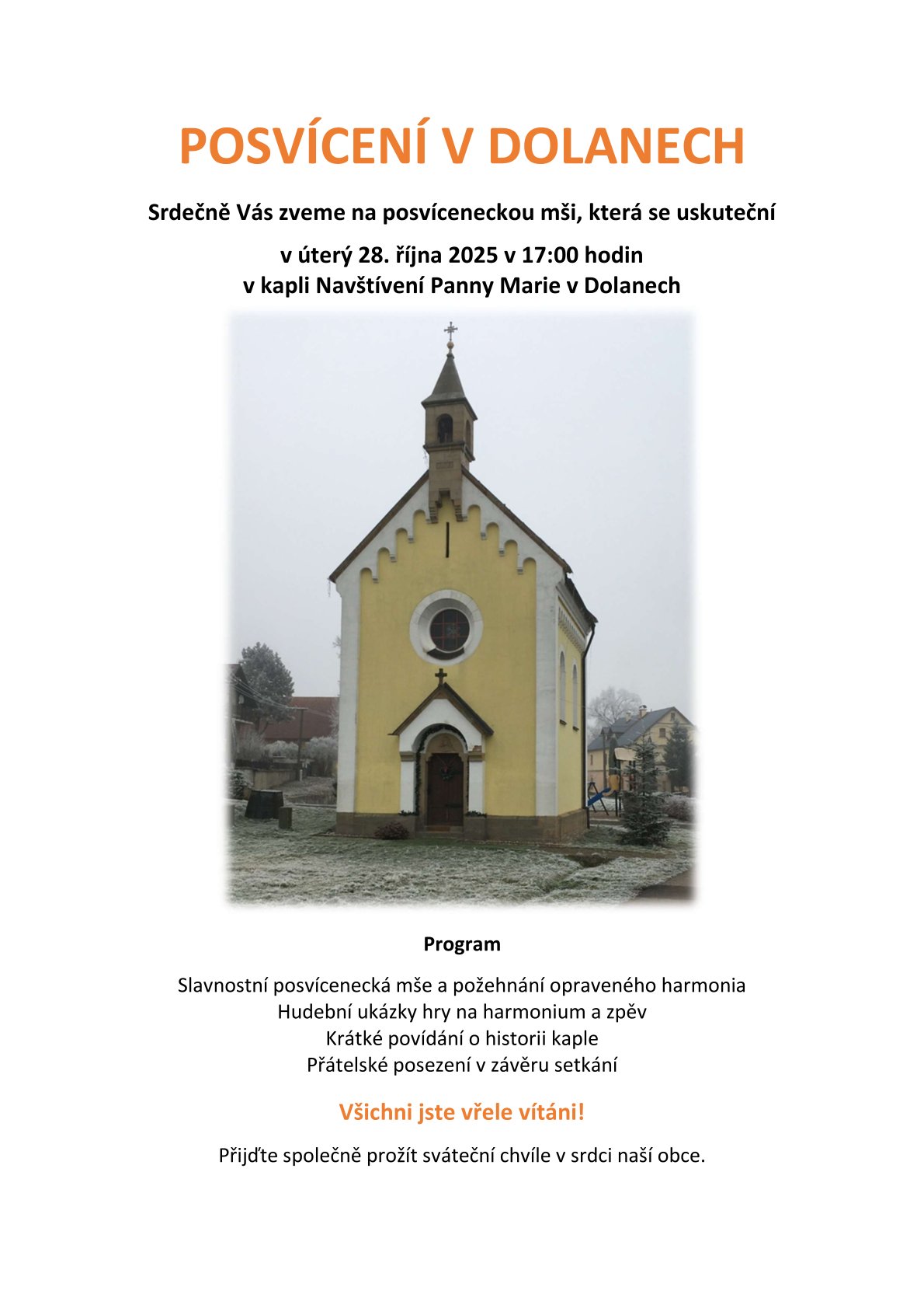 V úterý, 28. 10. 2025 se v 17.00 hod uskuteční v kapli Navštívení Panny Marie v Dolanech poutní slavnost, pŕi příletosti výročí posvěcení kaple. Všichni věřící obou našich farnosti jsou srdečně zvání...