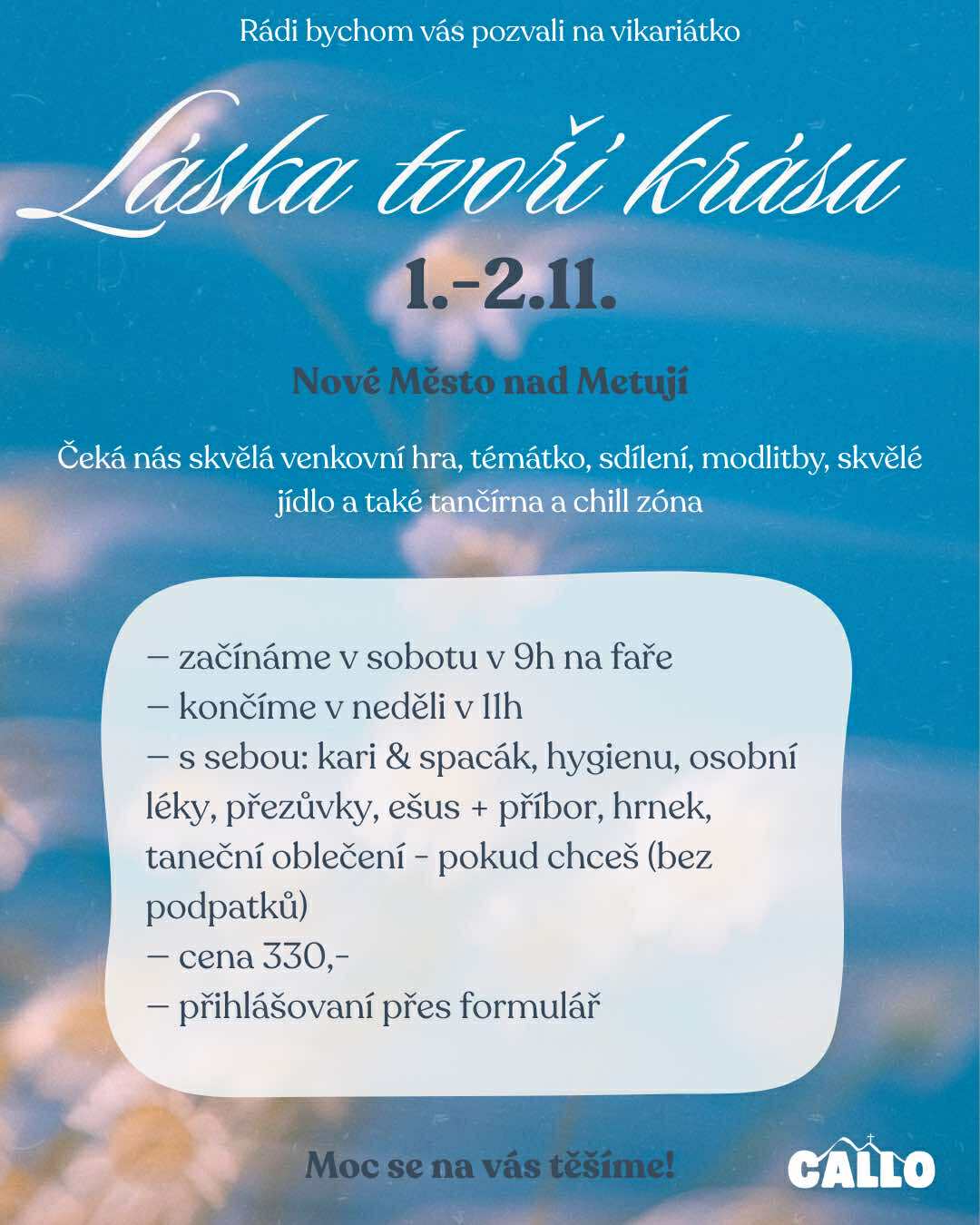 Vikariátní tým mládeže zve všechny 14+ na podzimní setkání v Novém Městě nad Metují. Čeká nás hra po městě, zamyšlení nad tím, jak může křesťan pozitivně působit na lidi a svět kolem sebe, a večer tančírna i pro začátečníky. Těšíme se 2.11. v 9 hodin na faře v Novém Městě.